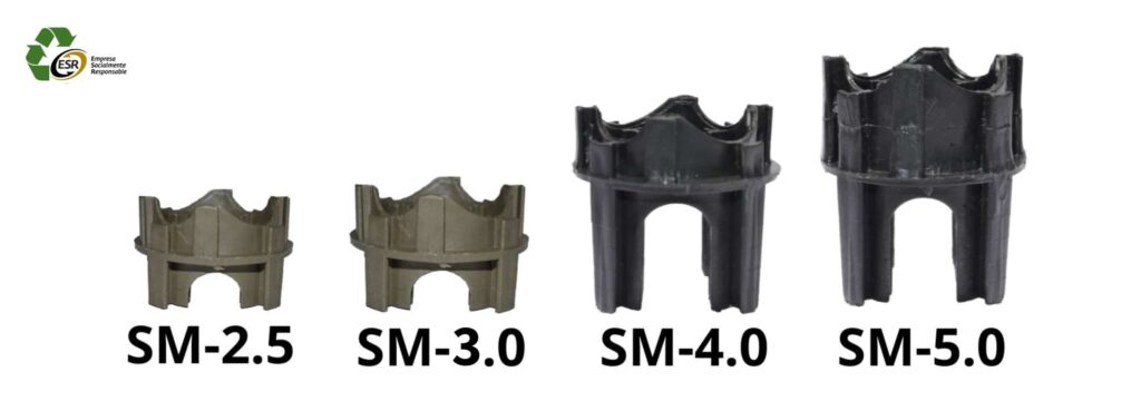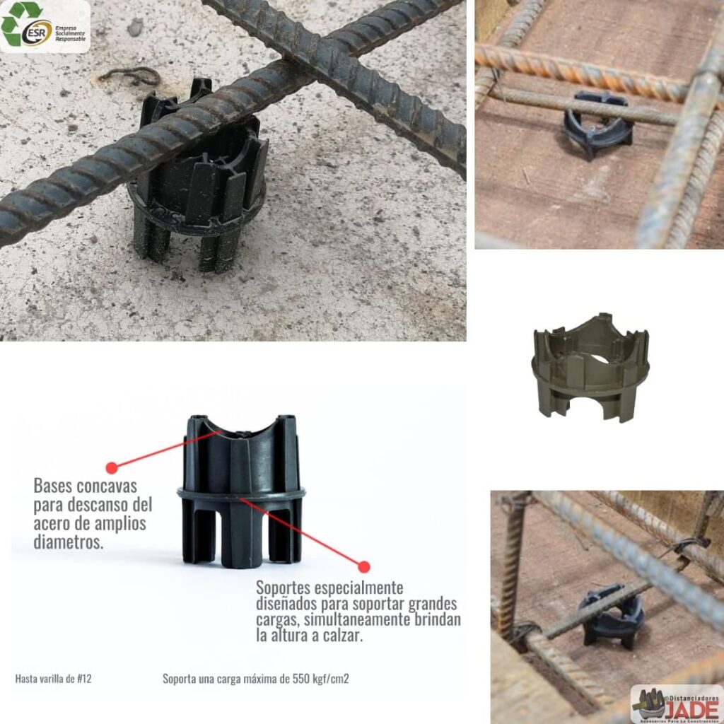 Medidas desde 2,5 cm hasta 11 cm, recibe mallas electro-soldadas y aceros desde 1/4″ hasta 3/8″ se recomiendan 3 unidades por metro cuadrado, elaborado el polipropileno paletizado reciclado de alta resistencia.